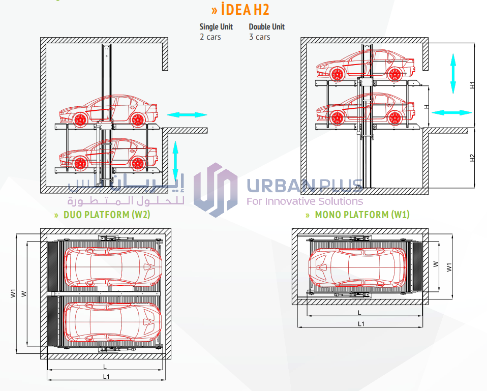 • يثبت نظام السيارتين على مساحة أرضية بمقدار ١٦ متر مربع.