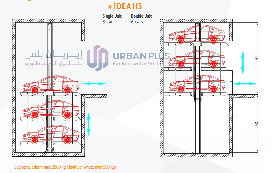 • يتوفر أنظمة من ٢ ـ ٦ سيارات ذات الأحجام المتعددة (حتى ٢٠٠٠ كغم/سيارة) للنظام الواحد، كما يمكن دمج أكثر من نظام لتوفير مساحة إضافية وعدد سيارات أكبر.